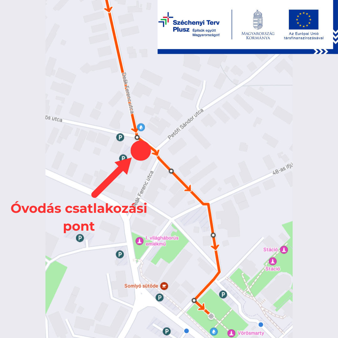 A Dózsa György u. – Kossuth Lajos u. csomópont átépítése miatt, ezt a szakaszt el kell kerülnünk. Így az óvodás futóink gyülekezési és csatlakozási pontja is új helyre kerül.
